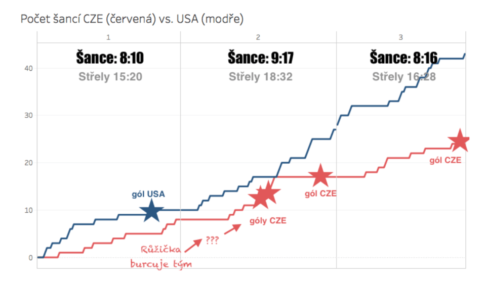 Paradoxně “statisticky” nejlepší byla ona proklínaná první třetina, ale to protože spoustu nebezpečných situací nedokázali Američané zakončit střelou na branku. Navíc jejich zakončení byla výrazně nebezpečnější. Na šance skončila první třetina z pohledu českého týmu “jen” 8:10, kdybychom měli pro mezinárodní turnaje smysluplný expected goals model (který přihlíží k místu střely a předchozímu pohybu puku), vypadalo by očekávané skóre mnohem hůř. Jenže vše dopadlo jinak.